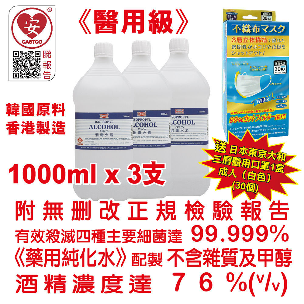 殺菌消毒酒精 消毒火酒 75%(v/v)1L 美國品牌 (醫用級) (3支裝)